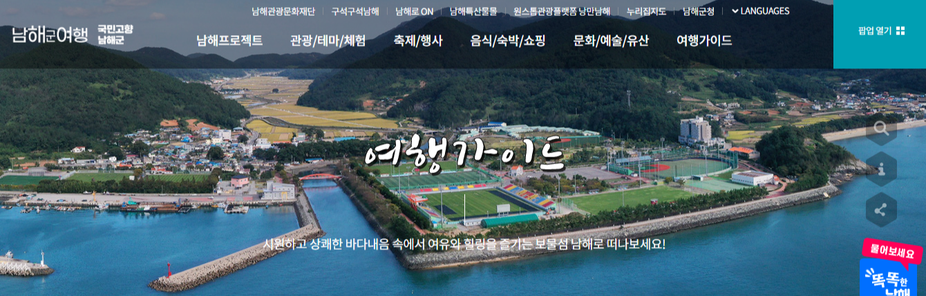 경남 남해군청 홈페이지 바로가기 : https://www.namhae.go.kr/ 경남 남해군 여행 홈페이지 바로가기 : https://www.namhae.go.kr/tour/main.web |
